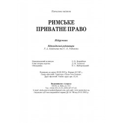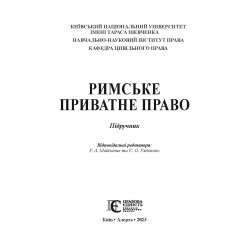 Підручник підготовлено відповідно до програми курсу римського приватного права. Висвітлюються загальні положення римського приватного права, цивільне судочинство, вчення про позов і засоби преторського захисту, особи в римському приватному праві, сімейні правовідносини, володіння і речові права, договірні і недоговірні зобов’язання та спадкування.